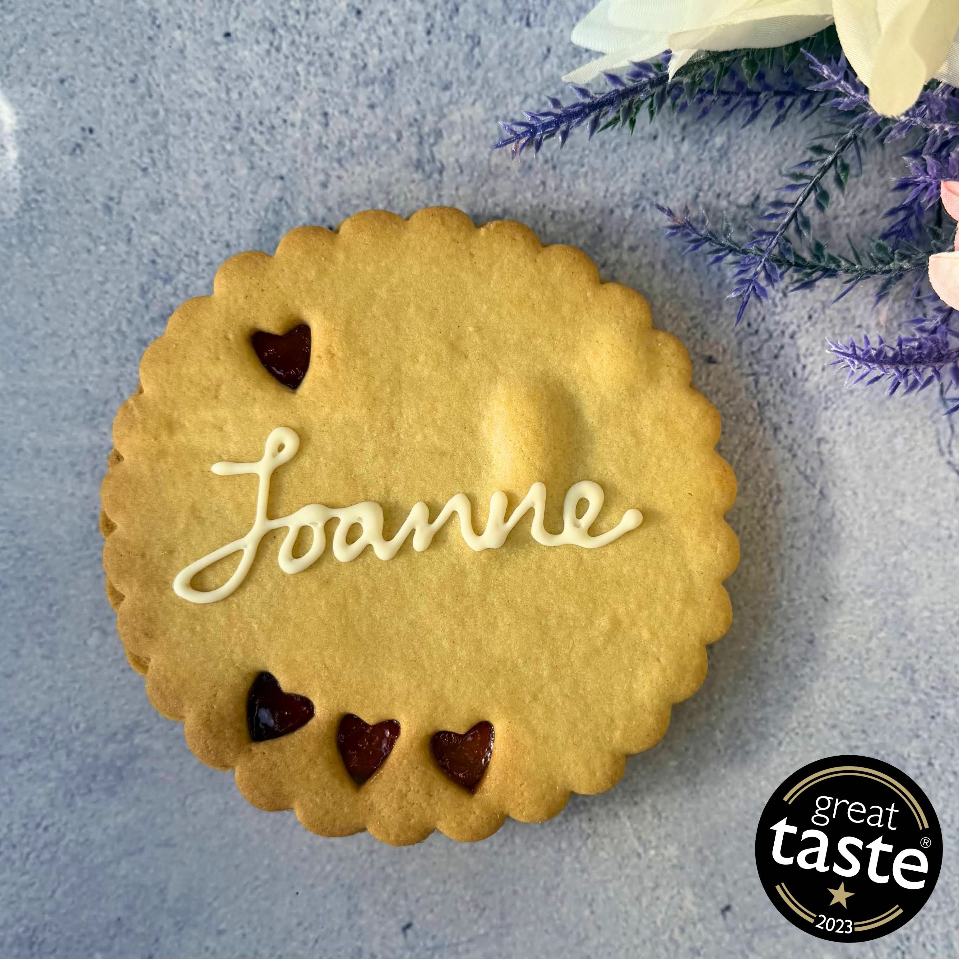 ✅ 1x Giant jam cookie (12.5 cm) with the name of your choice piped on with royal Icing