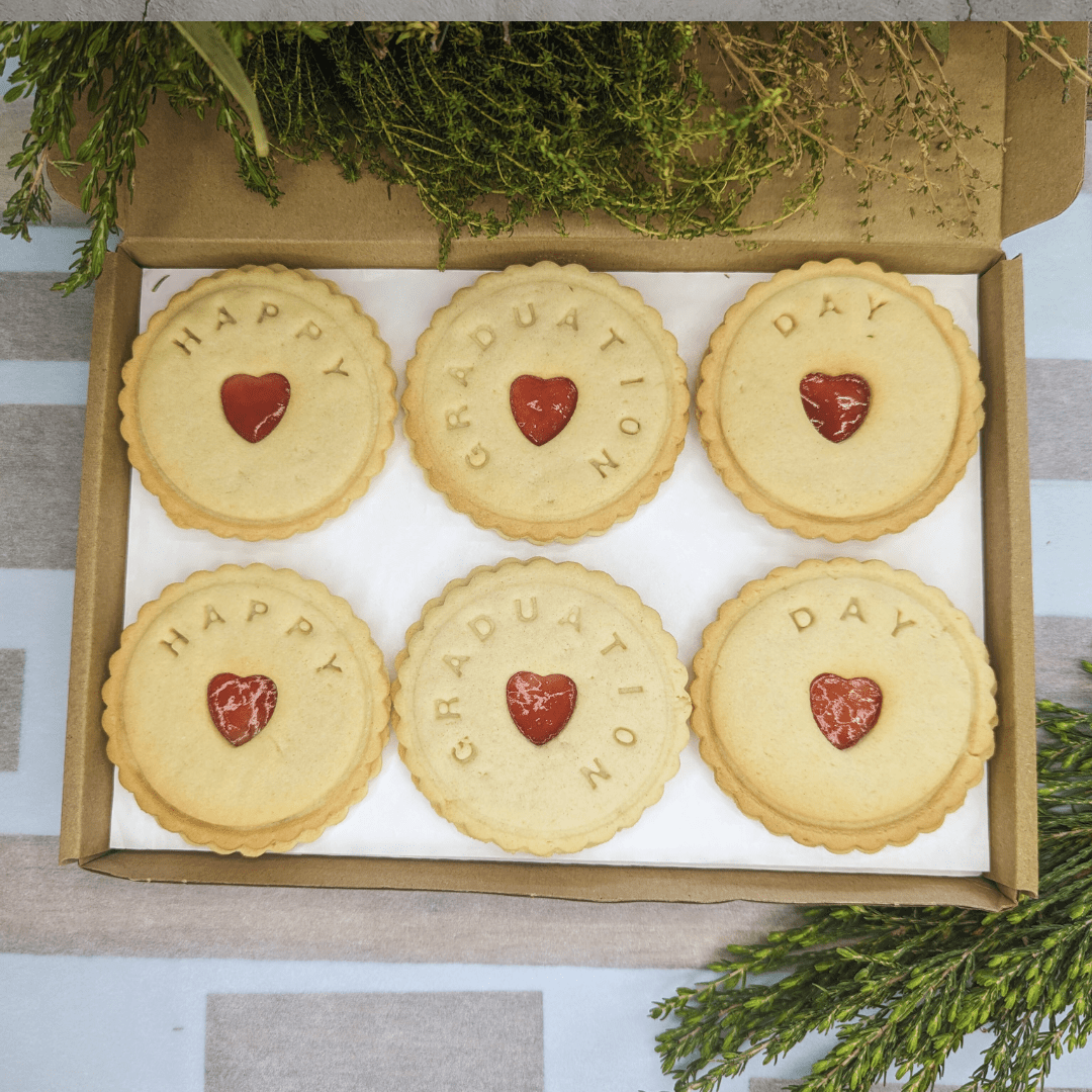 Celebrate a recent graduate with a Graduation Jam Box of celebratory jam biscuits. This beautifully presented box of 6 biscuits is designed to add a touch of sweetness to a joyous occasion.