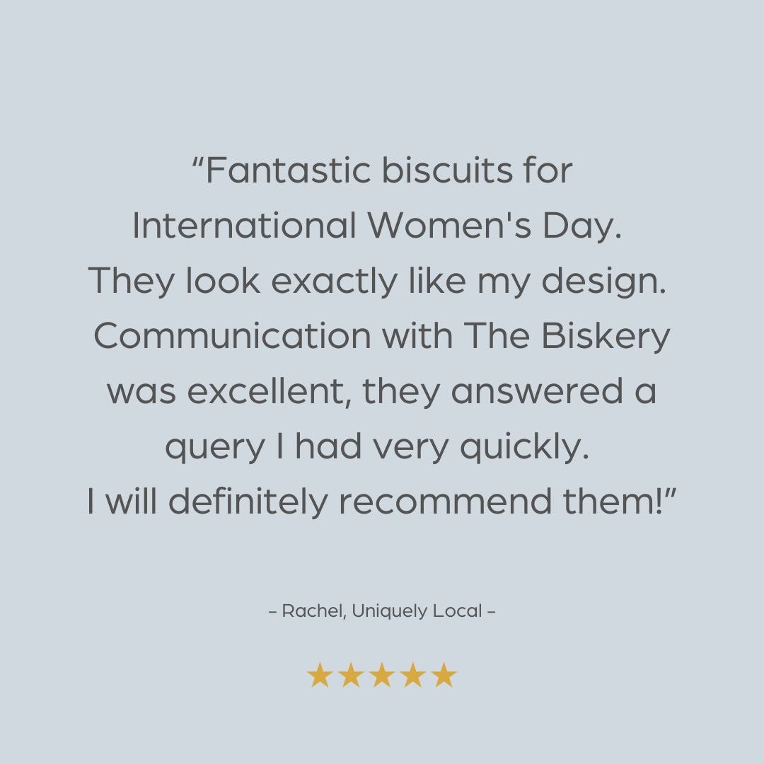 The minimum order quantity for your International Women's Day biscuits is 10. For orders over 100 units or for more bespoke options, please contact us! We will happily work with you to create the best International Women's Day biscuits for your requirements.