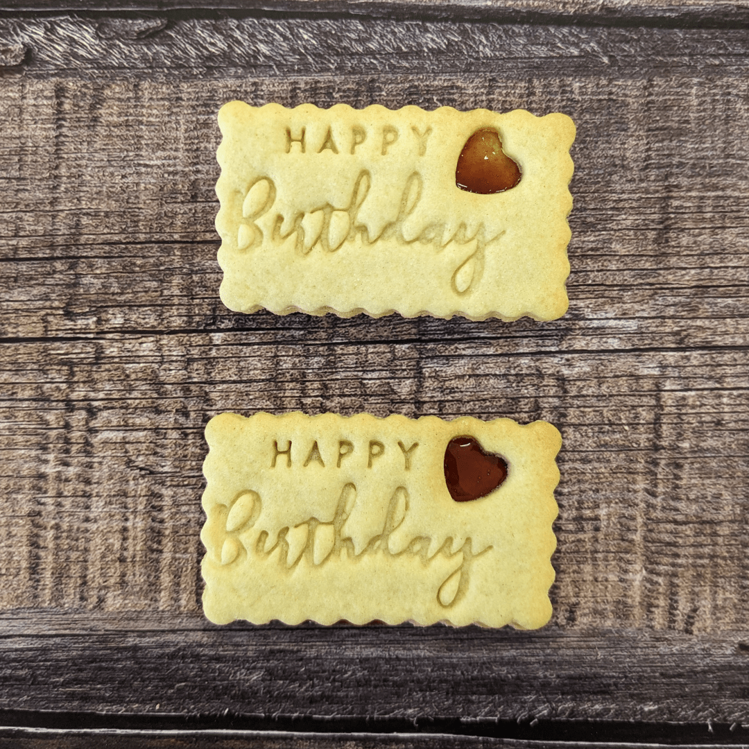 Rectangular Happy Birthday Jam Biscuits to enjoy as they are or perfectly boxed in tiny personalised boxes via our partner with Cotton Bird